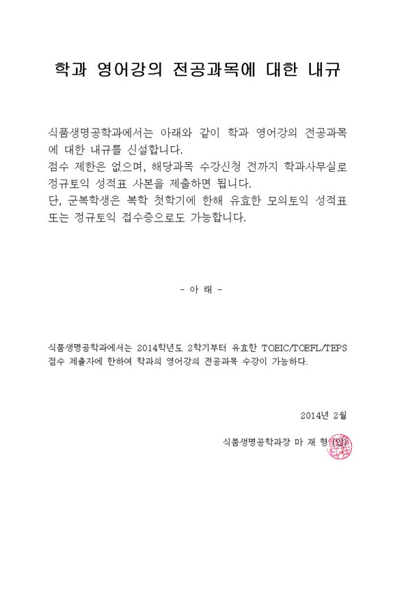 일반공지 학과 영어강의 전공과목에 대한 내규 식품생명공학과 2018.11.30 0 1696 첨부파일