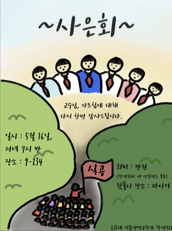 안녕하십니까 31대 식품생명공학과 학생회 입니다. 5월을 맞아 존경하는 교수님께 감사를 드리는 사은회 자리를 마련하였습니다. 한 학기의 마지막 행사를 즐겁게 마무리 하는 시간이 되었길 바랍니다. 모두들 수고하셨습니다^^
